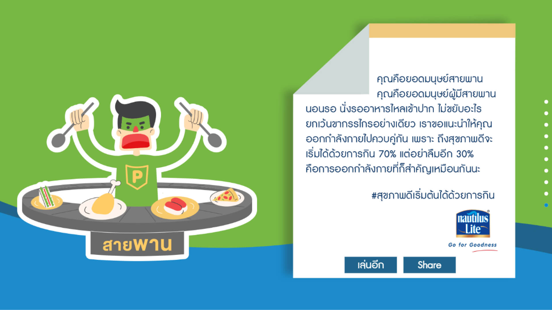 This interactive website was created to promote the healthy brand Nautilus Life. The concept was a quiz game designed to analyze your daily eating habits and allow users to share their results on their Facebook feed.